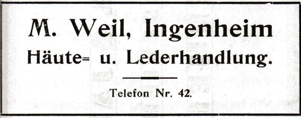 Im neuen Adressbuch von 1926 ist im Haus jetzt als Nr. 14 in der Hauptstraße das Lederhäutegeschäft von Moses Weil verzeichnet. Moses Weil, (geb. am 26. März 1876 in Ingenheim) führte hier sein florierendes Geschäft. Ältere Mitbürger können sich noch erinnern, dass sie als Buben für ein bei Moses Weil abgeliefertes Hasenfell 50 Pfennige erhalten haben, wofür sie ganze 5 Portionen Eis eintauschen konnten. 1938, nach der Reichspogromnacht, wurde Weil festgenommen und nach Dachau überführt. Zwischenzeitlich dann nach Berlin übersiedelt, wurde er am 14. September 1942 durch die Geheime Staatspolizei Berlin ins Getto Theresienstadt deportiert, wo er verstarb und am 4./5. April 1943 eingeäschert wurde (Sarg Nr. 14954).