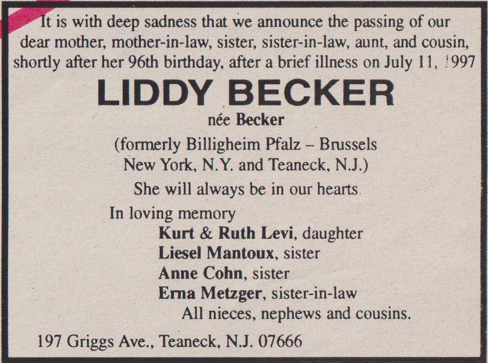 Liddy Sara Becker, Tochter von Daniel Becker und Elisabeth Bär aus Billigheim, heiratete am 26. März 1925 in Billigheim Ludwig Becker. Liddy ist mit Mannund Kind am 03.10.1935 nach Frankreich ausgewandert, wo Ludwig in Paris eine neue Existenz gründen wollte..