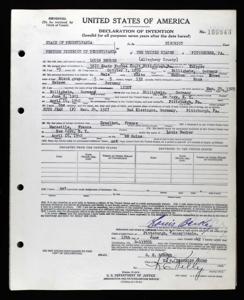 Letzter Wohnort vor Emigration: Graulhet - Emigration von Marseille mit SS Guine nach New York 16.4.1942 Ankunft – wohnhaft in Pittsburgh