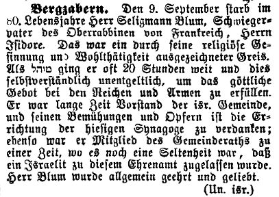 Seligmann Blum, Sohn der Eheleute Moses Blum und Besle Halfin aus Vorderweidenthal, war verheiratet mit Sprinz Levy. Seligmann starb im Alter von 79 Jahren und wurde auf dem jüdischen Friedhof Ingenheim beerdigt. Grabnummer: 3 01 04.