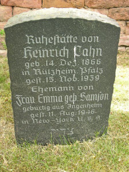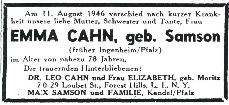 Emma heiratete am 20. Dezember 1898 Heinrich Cahn. Sohn Leo wurde am 05. September 1899 in Ingenheim geboren. Emma wanderte nach dem Tod ihres Mannes am 14. Dezember 1939 von Oslo aus mit dem Schiff Bergensfjord nach New York aus und kam dort am 23. Dezember 1939 an. Berufsangabe: Widow. Sie starb am 11. August 1946 nach kurzer Krankheit im Alter von nahezu 78 Jahren in 70-29 Loubet St. Forest Hills L.I.N.Y. Sie wurde auf dem Mannheimer Hauptfriedhof beerdigt - Grabnummer: E2-B-01-09.