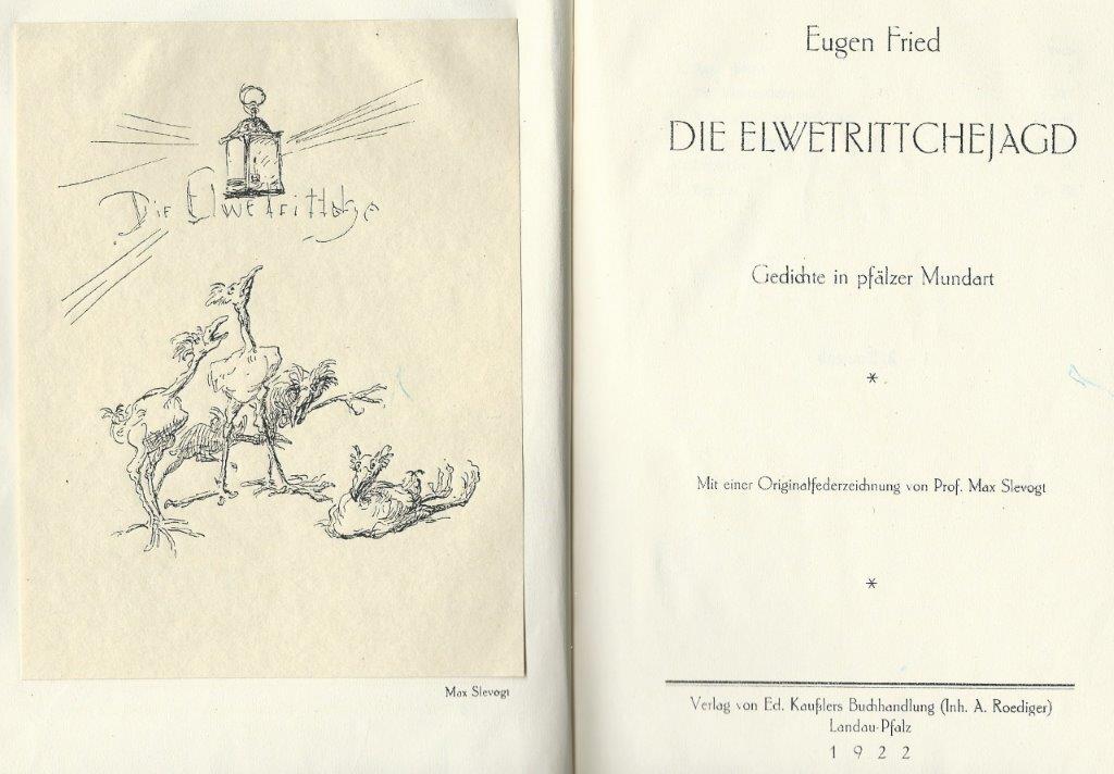 Eugen Fried war ein begnadeter Mundartdichter, der es meisterlich verstand, die Ingenheimer Sprache besonders in seinem von großem Erfolg gekrönten Gedichtbändchen "Die Elwetrittchejagd. Gedichte in Pfälzer Mundart" (Landau 1922, Nachdruck 1983) zum Zuge kommen zu lassen. Dazu hatte bei der Erstausgabe der "entartete" Künstler Max Slevogt auf eine der Innenseiten das Epos mit der Darstellung dreier Elwetrittche bereichert. Zur Freude seiner geschichtsbewussten pfälzischen Leser lässt Eugen Fried dort den "Preiß", den es als "Volondär" in die Pfalz verschlagen hat und der mit "wieschte Protze" und arroganter Besserwisserei den ungehobelten Pfälzern zeigen will, wo es lang zu gehen hat, in die Falle tappen. Der "Preiß" blamiert sich gründlich und wird zum Gespött. (3)