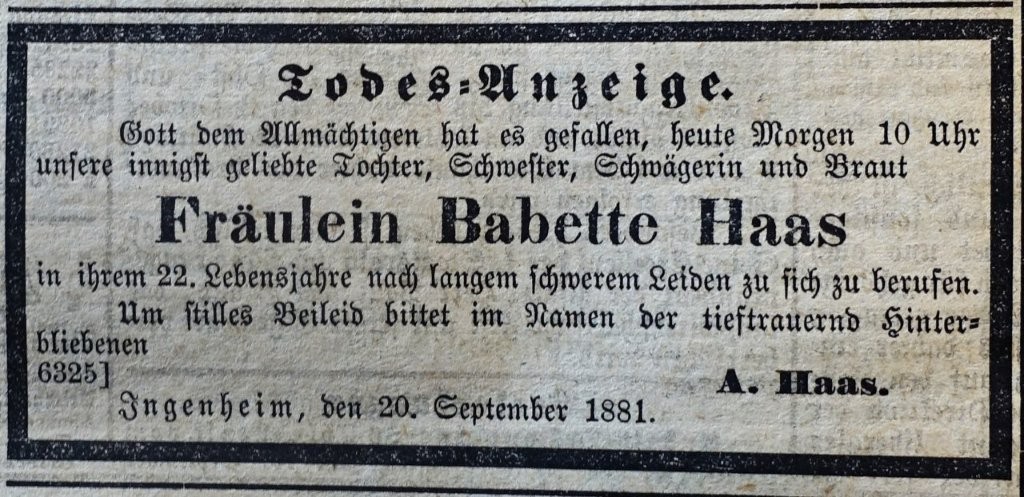 Barbara war die Tochter der Eheleute Abraham Haas und Judith geb. Metzger. Sie starb im Alter von 22 Jahren nach schwerem langem Leiden in Ingenheim und wurde auf dem jüdischen Friedhof dort begraben.