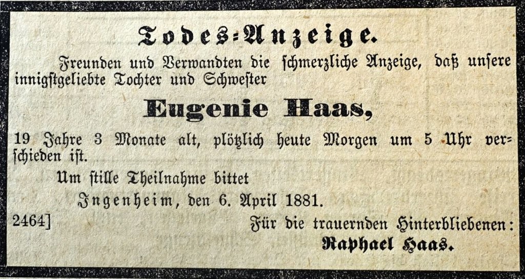 Eugenia war die Tochter der Eheleute Raphael Haas und Sara geb. Mayer.