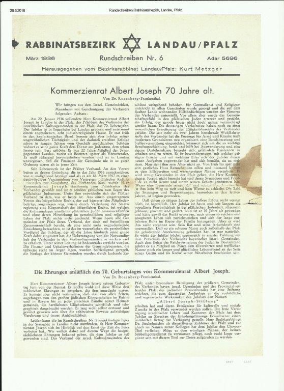 Nachdem Albert Joseph überaus erfolgreich im Weinhandel tätig gewesen war, zog er sich schon bald aus dem Geschäft zurück und überließ die Geschäftsführung seinen beiden Brüdern Emil und Richard Siegfried Joseph. Nun hatte Albert, der den Titel „Kommerzienrat“ trug, Zeit, um sich ganz auf sein Wirken bei der israelitischen Kultusgemeinde zu konzentrieren. Lange Zeit war er im Synagogenausschuss in Landau rege tätig. Außerdem engagierte er sich sehr, dass der Verband der israelitischen Kultusgemeinden der Pfalz, 1918 gegründet, den Status einer Körperschaft des öffentlichen Rechts einnehmen konnte. Als ihr Präsident wirkte er hier segensreich. Darüber hinaus war er im Verband der Bayerischen Israelitischen Gemeinden tätig.