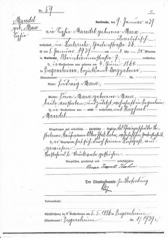 Auf Grund der Repressionen, denen die Juden auch in Ingenheim ausgesetzt waren, übersiedelte das Ehepaar Mandel 1938 nach Karlsruhe und fand Unterschlupf im Haus ihres Schwiegersohnes Isak Oskar Kahn in der Gartenstraße.