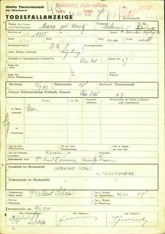 Wilhelmine starb im Alter von fast 87 Jahren im KZ Theresienstadt.