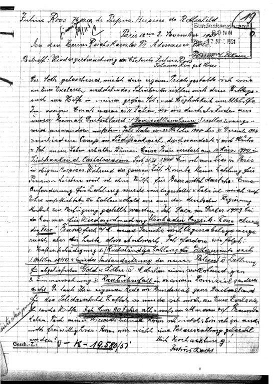 Julius war der Sohn von Israel Ross und dessen Ehefrau Sara geb. Joseph. Am 24. Februar 1892 heirateten Julius und Johanna, geb. Mai. Ihre drei Kinder Ernst Salomon, Wilhelm und Paul wuchsen in Ingenheim auf. Das Ehepaar lebte von 1921 bis 1933 in Neustadt / Weinstraße, zog dann zu Sohn Paul Roos nach Landstuhl (Kaiserstraße 12). Dort wohnten sie noch am 01. November 1938. Bald darauf zog das Ehepaar Roos nach Mannheim (M 7,23) und wurde von dort deportiert. Sie kamen 1941 nach Récébédou, dann nach Noé. Johanna Roos starb bei einem Luftangriff am 8. März 1944 in Castelsarrasin (Dép. Tarn et Garonne). Julius Roos überlebte in Frankreich und starb am 23. Januar 1953 in Paris (Quelle: R. Paul – Die nach Gurs deportierten pfälzischen Juden).